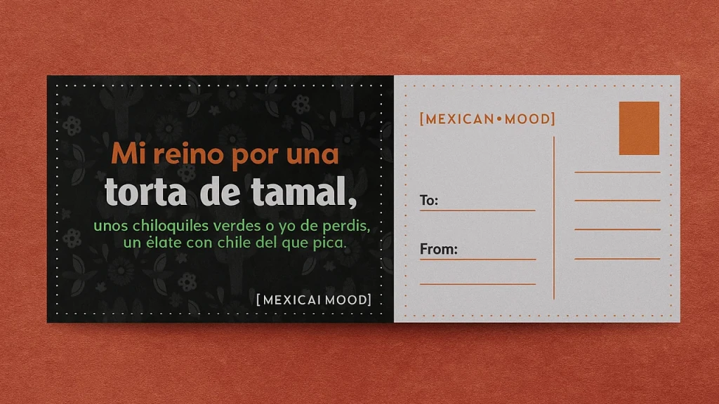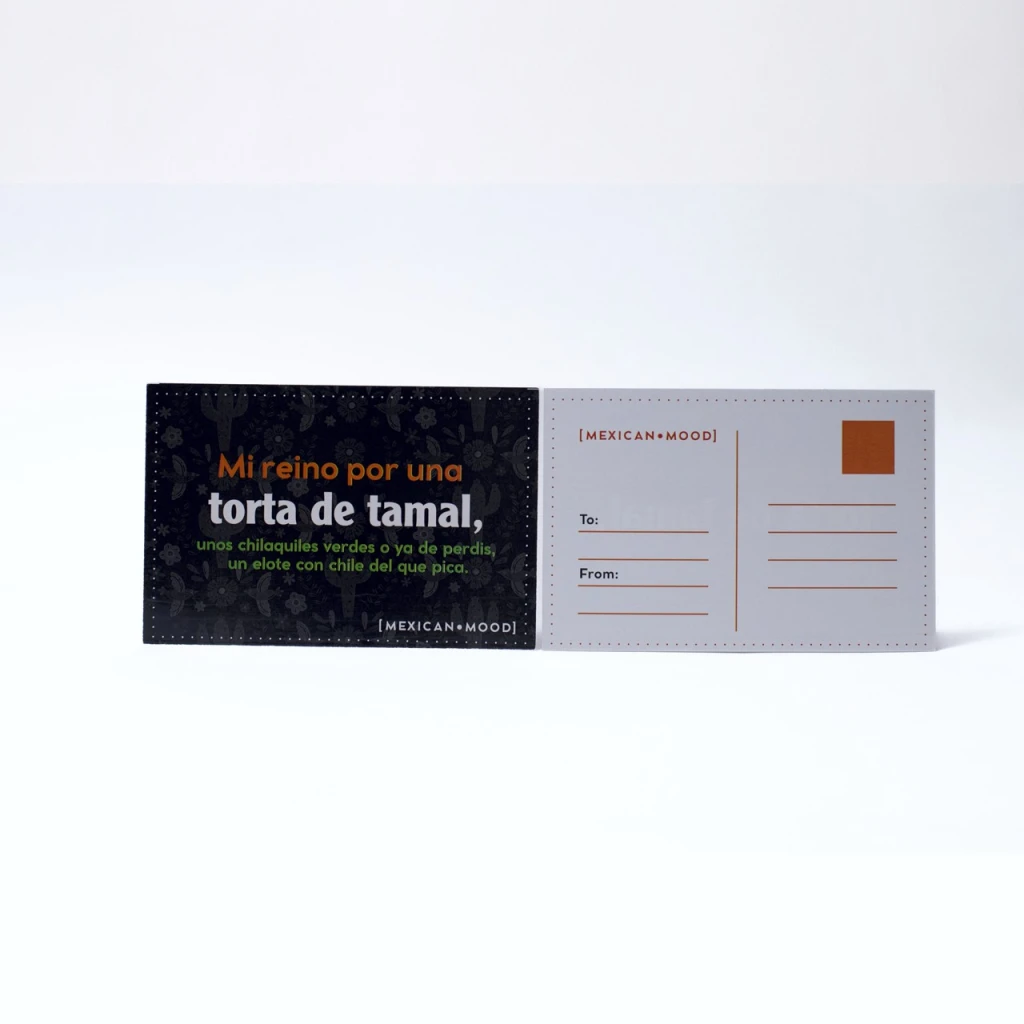 Diseño personalizado: Frase “Mi reino por una torta de tamal, unos chilaquiles verdes o un elote con chile del que pica” de la colección ¡Me representa! + diseño posterior para llenado de postal